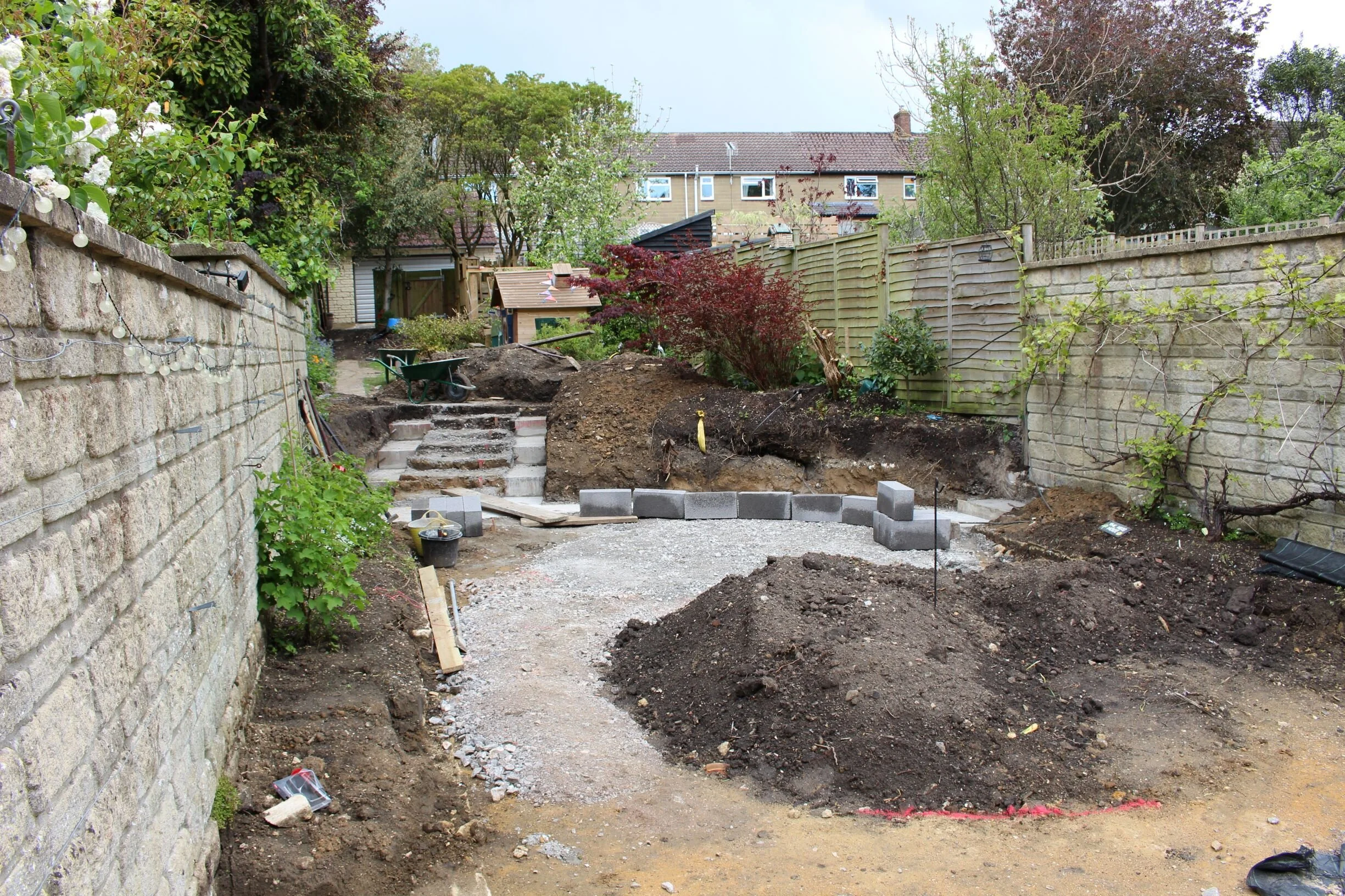Early summer and the build has started on this garden and it’s the neighbour of the one above. This is a family garden on two levels - the lower level will be an elegant space for relaxing and entertaining; the upper level will be a child friendly space for running about and making dens!